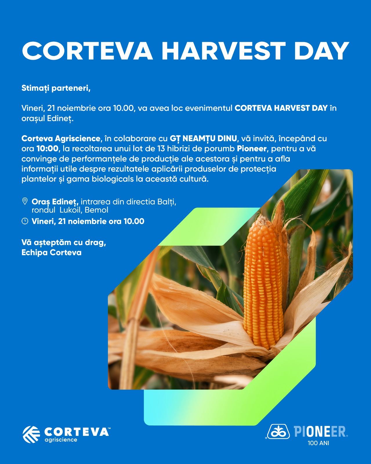 Corteva Agriscience organizează o nouă ediție Corteva Harvest Day la porumb din acest an. Evenimentul se va desfășura în colaborare cu GT Neamțu Dinu, vineri, 21 noiembrie, ora 10:00.