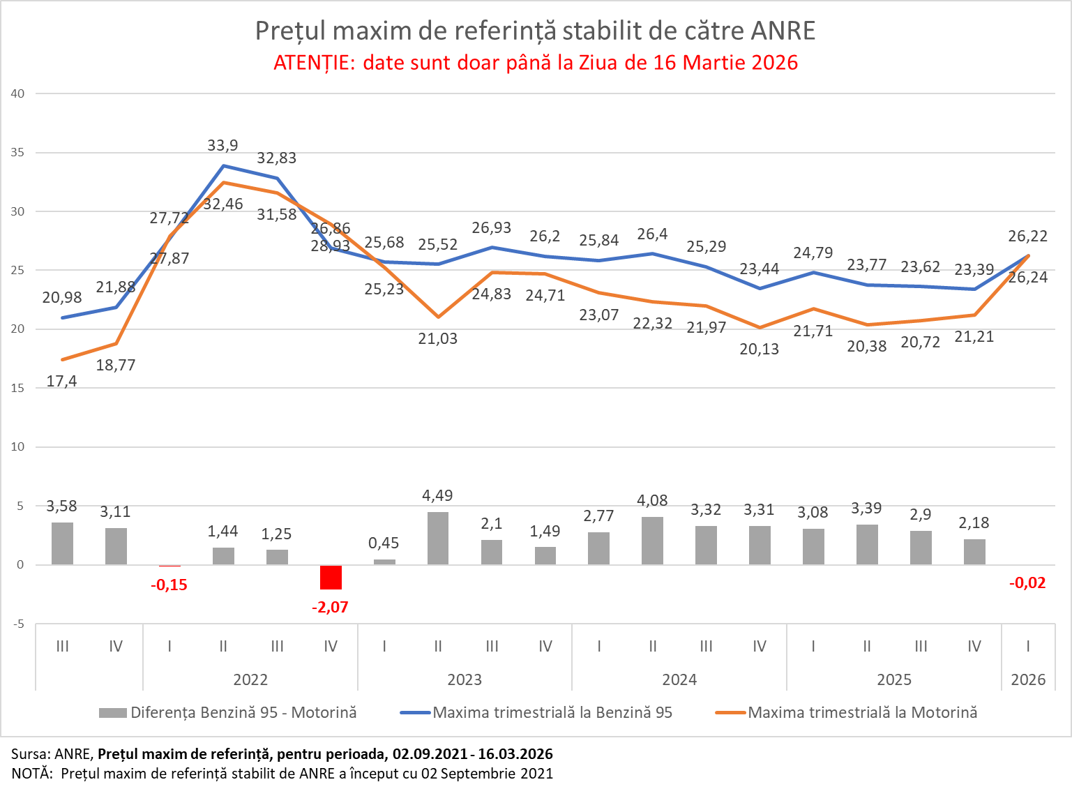 Astfel, prețul maxim de referință, stabilit la data de 16.03.2026 aplicabil pentru data de 17.03.2026 pentru benzină 95 este 26,72, iar motorina a ajuns la 27,05.
