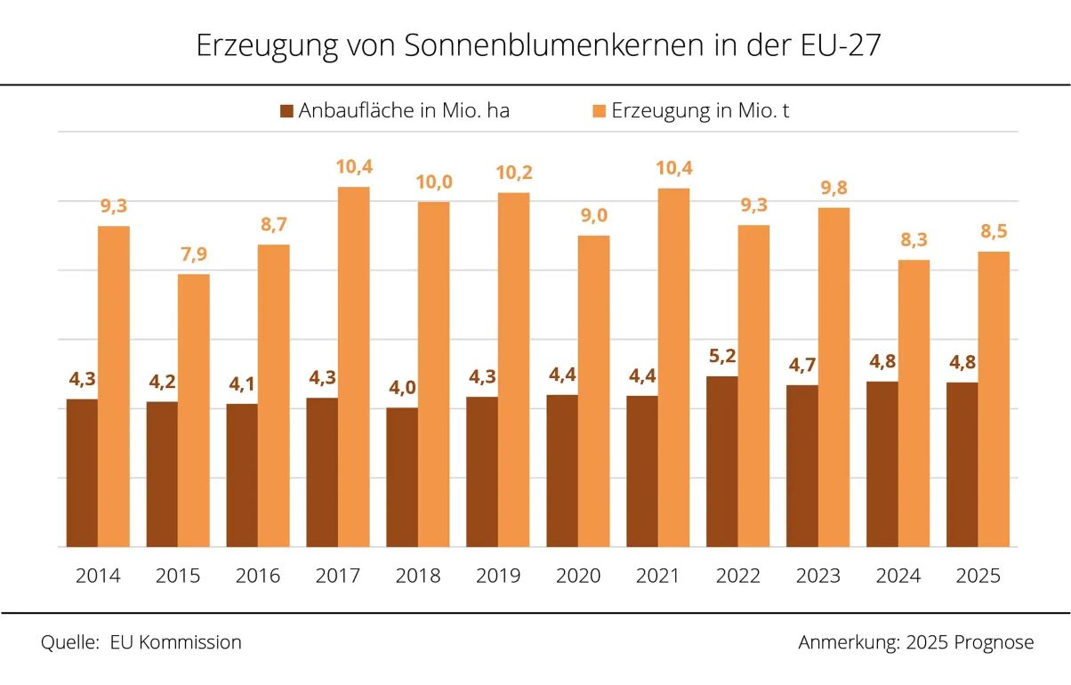 На урожай подсолнечника во Франции негативно повлияла продолжительная засуха и жара в летние месяцы. Еврокомиссия недавно прогнозировала урожай чуть менее 1,5 млн тонн, что на 25 000 тонн меньше, чем в и без того неутешительном 2024 году. Это означает, что второй год подряд урожай будет значительно ниже среднего многолетнего показателя в 1,8 млн тонн, в первую очередь из-за сокращения посевных площадей примерно на 9%.