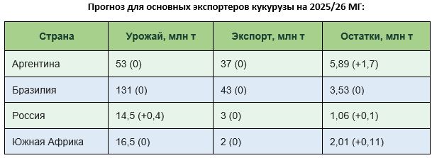 USDA прогнозирует мировое производство кукурузы в 2025/26 МГ на уровне 1 282,96 млн т (-3,27 млн т по предварительному прогнозу). Оценка мирового экспорта кукурузы – 205,1 млн т (+1,63 млн т), прогноз конечных запасов – 279,15 млн т (-2,19 млн т).