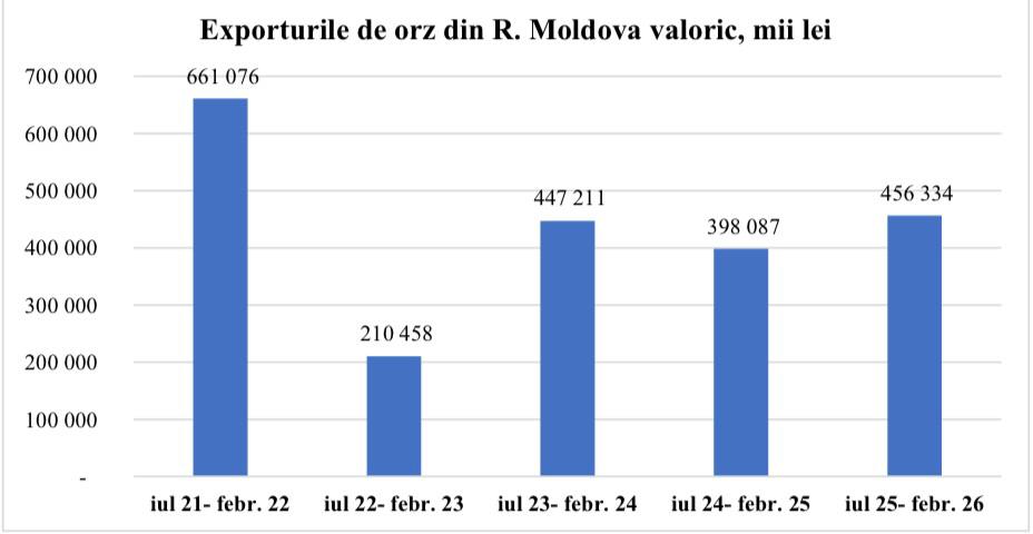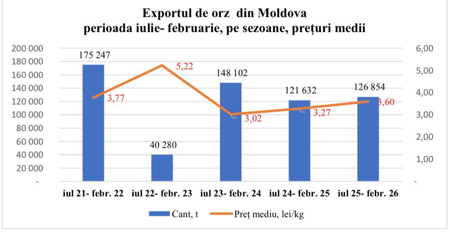 În sezonul 2025–2026, în perioada iulie–februarie, Republica Moldova a exportat 126 854 tone de orz, ceea ce reprezintă o creștere de 4,3% comparativ cu perioada similară a sezonului precedent. Ritmul și nivelul exporturilor se încadrează în parametri normali pentru piața locală, volumul fiind unul tipic pentru un sezon agricol obișnuit din Republica Moldova.