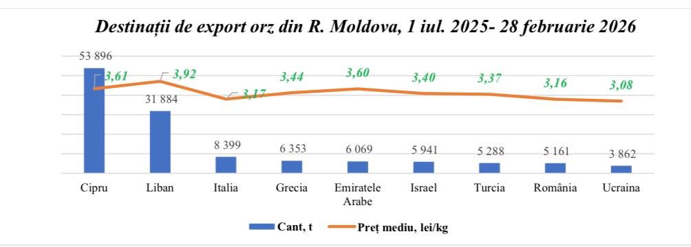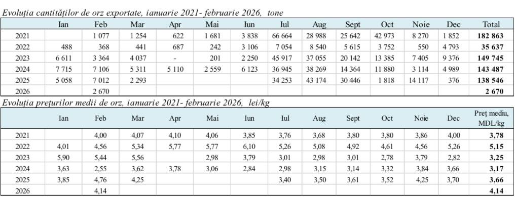 În perioada ianuarie–februarie 2026, exporturile de orz din Republica Moldova au marcat practic finalul sezonului comercial, stocurile fiind epuizate aproape integral încă din lunile anterioare. În ianuarie 2026 nu s-au înregistrat deloc livrări externe de orz, iar în februarie a fost consemnat un singur export, în volum de 2 670 tone, rezultat dintr-o tranzacție punctuală, cu livrare realizată prin intermediul transportului maritim, către Liban.
