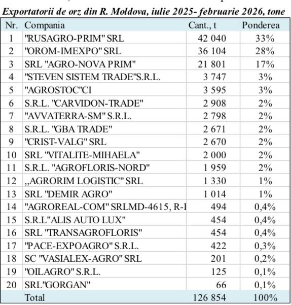 Structura exportatorilor de orz din Republica Moldova în sezonul 2025–2026 evidențiază participarea a 20 de companii active, însă piața rămâne concentrată de principalii traderi. Liderul este „RUSAGRO-PRIM” SRL, cu un volum de 42 040 tone și o cotă de 33%, urmat de „OROM-IMEXPO” SRL cu 36 104 tone și 28%, iar pe locul trei se poziționează SRL „AGRO-NOVA PRIM” cu 21 801 tone și 17%. Împreună, cei trei exportatori au livrat peste 99 000 tone, concentrând 78% din totalul exporturilor de orz.