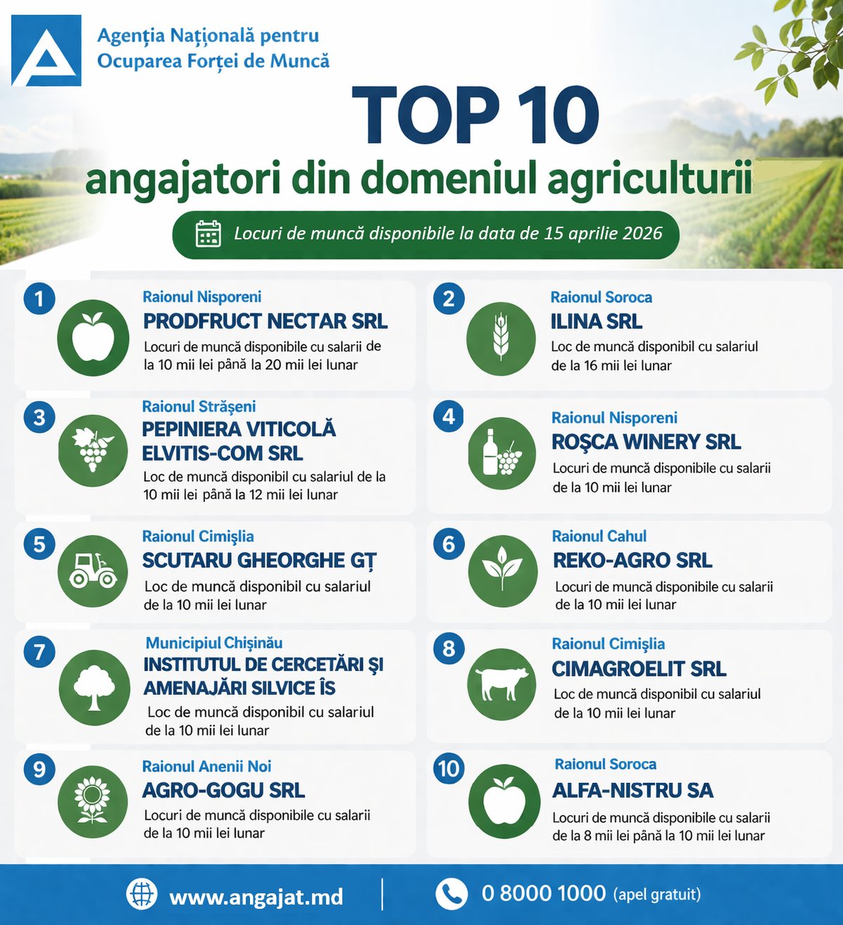 Agenția Națională pentru Ocuparea Forței de Muncă (ANOFM) a publicat lista celor mai activi angajatori din domeniul agriculturii, în funcție de locurile de muncă disponibile la data de 15 aprilie 2026. Oferta acoperă mai multe raioane ale țării, iar salariile pornesc de la circa 8 mii lei și pot ajunge până la 20 mii lei lunar.