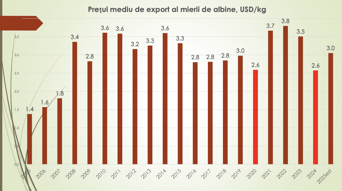 Prețul mediu de export al mierii de albine din Republica Moldova a înregistrat în ultimii ani o evoluție volatilă, fără a reveni la nivelurile maxime din perioadele favorabile. Potrivit analizei realizate de economistul Veaceslav Ioniță, după un vârf de aproximativ 3,8 dolari/kg în 2022, prețul s-a redus semnificativ în 2023 și 2024. În anul 2025, prețul mediu de export este estimat la aproximativ 3,0 dolari/kg, ceea ce indică o ușoară revenire față de anul precedent, însă nivelul rămâne inferior atât anilor de vârf, cât și perioadei 2008–2015, când prețurile de export se situau constant peste 3,4–3,6 dolari/kg.