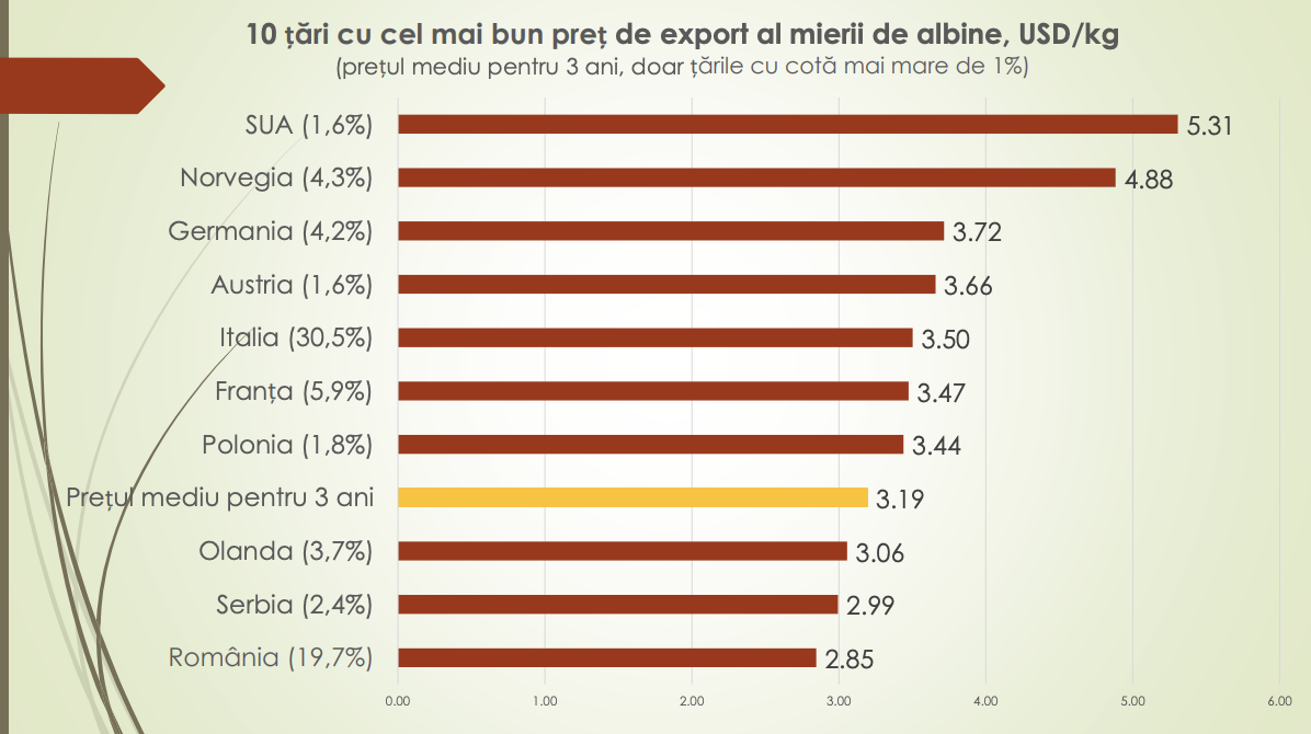 Analiza comparativă a prețurilor medii de export pentru ultimii trei ani arată că Republica Moldova se situează sub nivelul principalelor piețe europene. În timp ce Statele Unite obțin un preț mediu de 5,31 dolari/kg, iar Norvegia – 4,88 dolari/kg, țări precum Germania și Austria exportă mierea la peste 3,7 dolari/kg.