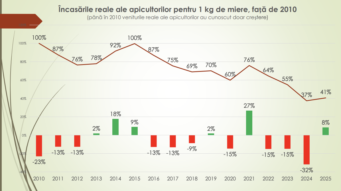 Potrivit analistului economic, ramura apicolă rămâne extrem de vulnerabilă la fluctuațiile de preț. În 2025, apicultorii au încasat, în termeni reali, doar aproximativ 40% din veniturile obținute pentru un kilogram de miere în anul 2010. Practic, pentru a obține același venit ca acum 15 ani, un apicultor este nevoit să vândă de 2,5 ori mai multă miere.