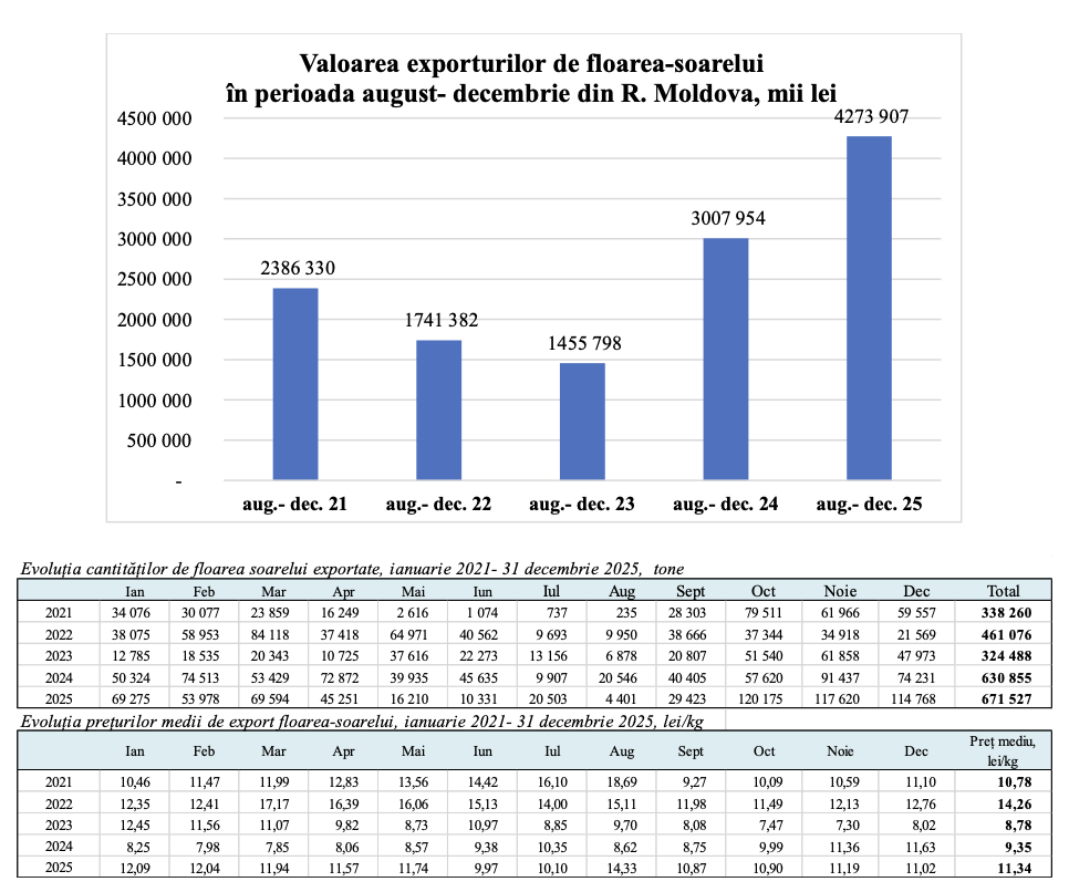 Combinația dintre volumele mari exportate și prețurile favorabile s-a reflectat direct în rezultatul financiar. În perioada august–decembrie 2025, Republica Moldova a obținut 4 miliarde 273 milioane lei din exporturile de floarea-soarelui.