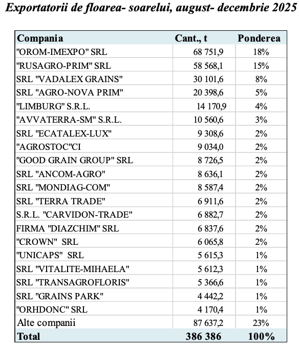 Privind strict floarea-soarelui din roada actuală, în perioada august–decembrie 2025, exporturile au totalizat 386,4 mii tone, cu 36% mai mult față de aceeași perioadă din 2024 (284,2 mii tone).