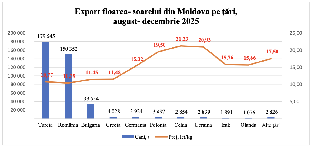 Prețurile favorabile și concentrarea pe câteva piețe-cheie au transformat sezonul 2025–2026 într-unul excepțional pentru exporturile de floarea-soarelui ale Republicii Moldova. În perioada august–decembrie 2025, prețul mediu de export a ajuns la 11,06 lei/kg, cu circa 5% peste nivelul sezonului precedent și cu aproximativ 44% mai mare decât în 2023, când media era de doar 7,70 lei/kg, susține expertul Iurie Rija.