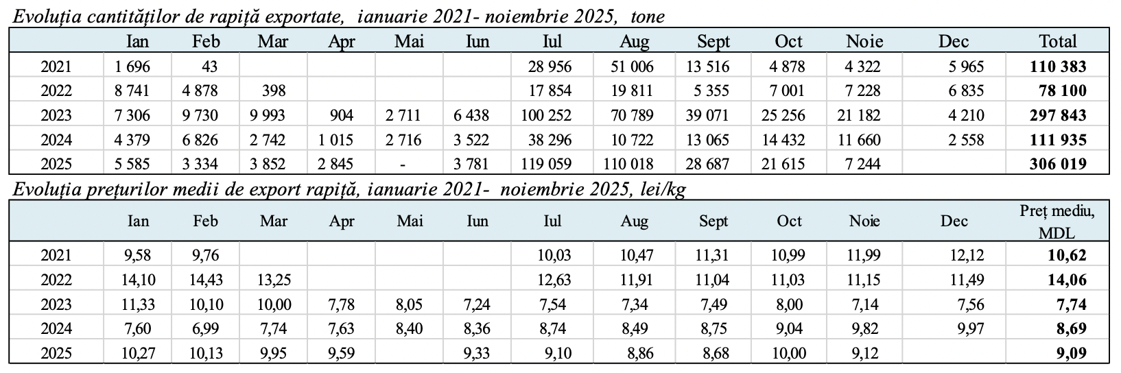 În luna noiembrie 2025, exporturile au totalizat 7 244 tone, expediate exclusiv pe cale rutieră — un indicator al încheierii sezonului comercial. Volumul redus față de lunile anterioare confirmă trendul anticipat încă din septembrie, când ritmul de livrare a început să scadă după exodul intens din lunile iulie–august. Rapița exportată în noiembrie a avut un preț mediu de 9,12 lei/kg, mai mic decât cel din octombrie (10 lei/kg), ceea ce reflectă o cerere aflată în retragere specifică finalului de sezon.