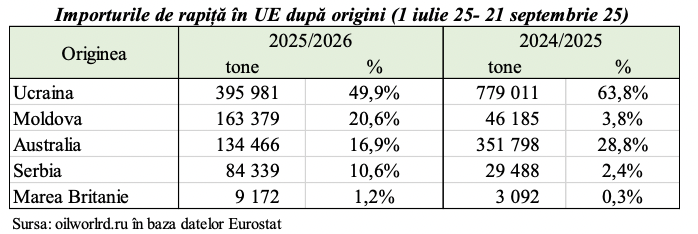 Poziția Moldovei se remarcă și mai mult dacă este analizată în raport cu ceilalți furnizori. Ucraina rămâne principalul exportator de rapiță către UE, dar și-a diminuat ponderea de la 63,8% în sezonul precedent la 49,9% în prezent, cu volume în scădere de la 779 011 tone la 395 981 de tone. Australia, tradițional un furnizor major, și-a redus livrările de la 351 798 de tone la 134 466 de tone, coborând la o cotă de 16,9%.