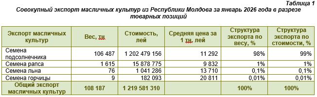 В январе 2026 года Республика Молдова экспортировала масличные культуры четырёх видов: семена подсолнечника, рапса, льна и горчицы. Само по себе наличие четырёх товарных позиций свидетельствует о диверсифицированной структуре предложения, хотя реальная концентрация вывоза оказалась весьма высокой. Данные об общем объёме и стоимости экспорта представлены в таблице 1.