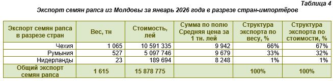 Несмотря на скромный абсолютный объем — 1 615 тонн и около 15,9 млн леев, — экспорт семян рапса демонстрирует четкую и логичную структуру. В январе 2026 года рапс поставлялся всего в три страны, что отражает как ограниченность предложения, так и высокую избирательность покупателей. Сводная картина представлена в таблице 4.