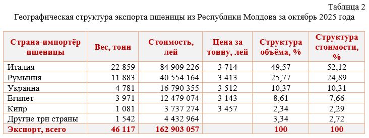 Экспорт пшеницы традиционно выступает флагманом молдавских зерновых поставок, и октябрь 2025 года не стал исключением. За месяц было отгружено 46,1 тыс. тонн пшеницы на сумму 162,9 млн леев, при средней цене реализации 3 532 лея за тонну. Продукция нашла своих покупателей в восьми странах, что демонстрирует расширяющуюся географию сбыта и способность молдавских экспортёров работать как с ближними соседями, так и с дальними рынками. Детальная картина распределения пшеничного экспорта по странам-импортёрам представлена в таблице 2.Безоговорочное лидерство принадлежит Италии, которая приобрела 22,9 тыс. тонн молдавской пшеницы, что составляет без малого половину всего октябрьского объёма — точнее, 49,57 %. Стоимость поставок достигла 84,9 млн леев, при цене 3 714 леев за тонну. На втором месте Румыния с показателем 11,9 тыс. тонн и долей 25,77 %, что эквивалентно 40,6 млн леев выручки, по цене 3 413 леев. Украина заняла третью позицию, импортировав 4,8 тыс. тонн пшеницы за 16,8 млн леев, по цене 3 512 леев, обеспечив 10,37 % октябрьского объёма.