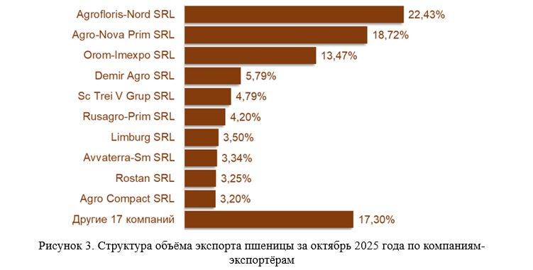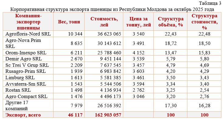 Переходя к рассмотрению компаний-экспортёров пшеницы, обращаемся к таблице 3, которая раскрывает конкурентную среду молдавского рынка.В октябре пшеницу экспортировали 27 молдавских компаний, что свидетельствует о достаточно фрагментированной структуре отрасли с множеством активных игроков разного масштаба.