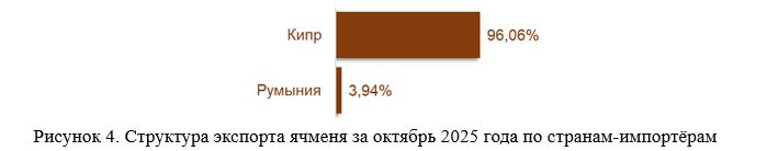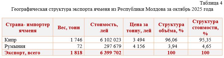 Согласно данным таблицы 4, подавляющая часть молдавского ячменя в октябре была отправлена на Кипр.Островное государство закупило 1,7 тыс. тонн продукции на сумму 6,1 млн леев, по цене 3 494 лея за тонну, обеспечив себе доминирующую долю в 96,06 % по объёму и 95,35 % по стоимости. Румыния стала единственным альтернативным направлением, импортировав всего 72 тонны ячменя на 0,3 млн леев, что составило лишь 3,94 % от общего объёма. Интересно, что румынская цена оказалась заметно выше кипрской — 4 156 леев против 3 494 леев, разница составила 19 %.