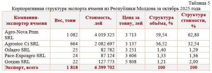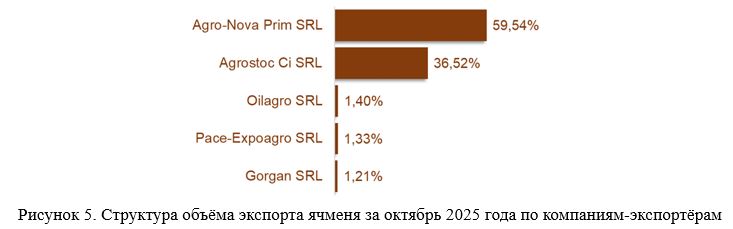 В октябре ячмень экспортировали пять молдавских компаний, что свидетельствует о компактности сектора и наличии чётко определённых лидеров с устоявшимися торговыми каналами.