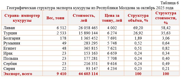 Детальная картина распределения кукурузного экспорта по странам-импортёрам представлена в таблице 6.Лидирующие позиции уверенно занимает Ливан, который приобрёл 6,5 тыс. тонн молдавской кукурузы на сумму 26,1 млн леев, по цене 4 002 лея за тонну. Доля ближневосточной страны составила 69,20 % по объёму, что делает её ключевым покупателем октябрьских поставок. Однако в стоимостном выражении позиция Ливана ослабевает до 58,42 %, теряя почти 11 процентных пунктов из-за относительно низкой цены закупки.
