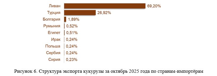 Географическая структура экспорта кукурузы наглядно представлена на рисунке 6, где отчётливо видна ведущая роль ливанского направления и значимость турецкого рынка.