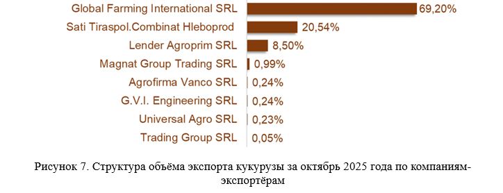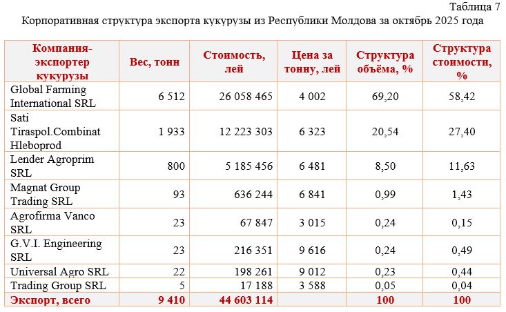 Абсолютным лидером является компания Global Farming International SRL, отгрузившая 6,5 тыс. тонн кукурузы на сумму 26,1 млн леев, по цене 4 002 лея за тонну. Доля компании составила внушительные 69,20 % по объёму, что фактически делает её монополистом в экспорте кукурузы в октябре. В стоимостном выражении позиции Global Farming несколько слабее — 58,42 %, что связано с относительно невысокой ценой реализации, ориентированной на массовый ливанский рынок.