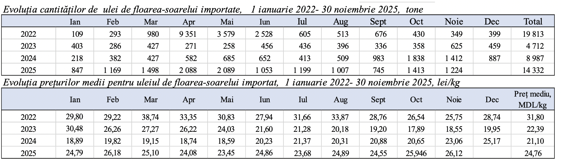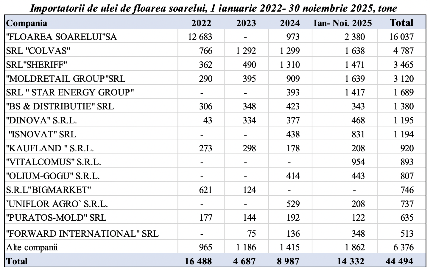 În total, în perioada 2022 – noiembrie 2025, importurile cumulate de ulei de floarea-soarelui se ridică la 44 494 tone.