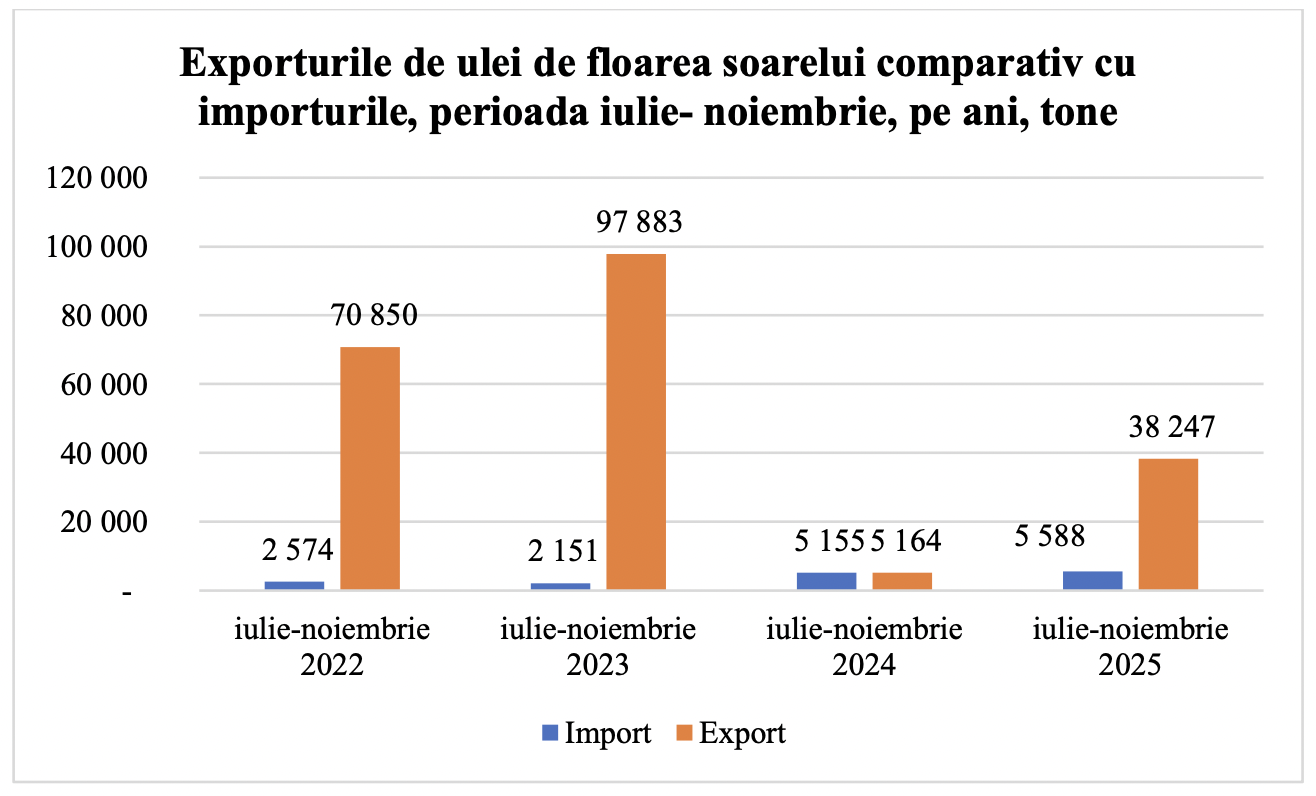 Pe parcursul perioadei iulie–noiembrie 2025, Republica Moldova a exportat 38 247 tone de ulei de floarea-soarelui, în timp ce importurile au însumat 5 588 tone. Cu alte cuvinte, livrările externe au fost de aproape șapte ori mai mari decât volumele intrate în țară. Este un rezultat considerabil mai bun față de sezonul precedent, când raportul dintre export și import, în 2024, era practic egal, semnalând atunci colapsul profund al procesării interne.