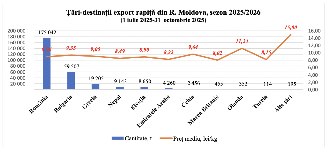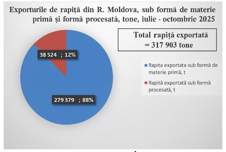 Un element nou al sezonului este revenirea Moldovei pe piața exporturilor de ulei și șrot de rapiță, după o pauză de aproximativ 15 ani. Odată cu repornirea procesării interne, în perioada analizată au fost exportate și 38 524 tone de produse procesate, ceea ce ridică volumul total valorificat pe piețele externe la circa 318 mii tone.