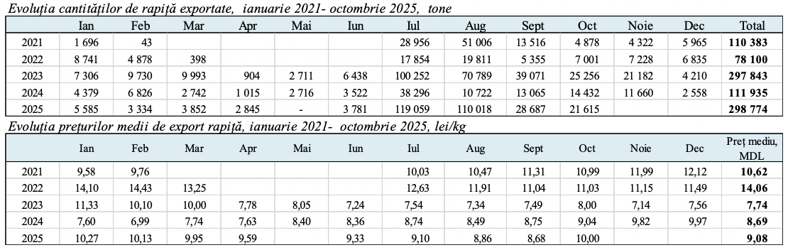 Deși perioada de vârf pentru exporturile de rapiță rămâne iulie–august, luna octombrie 2025 a înregistrat 21 600 tone exportate, cu un preț mediu de 10 lei/kg, confirmând un interes stabil al cumpărătorilor externi.