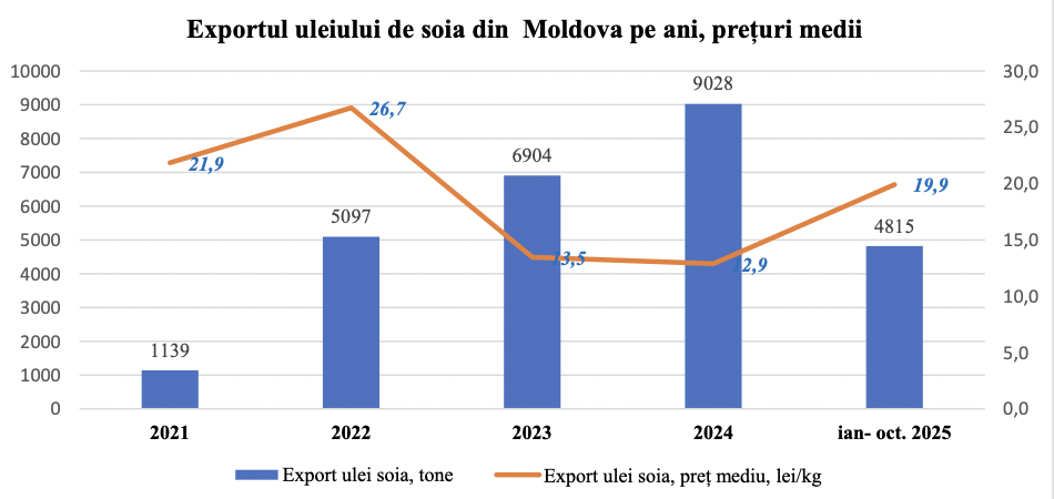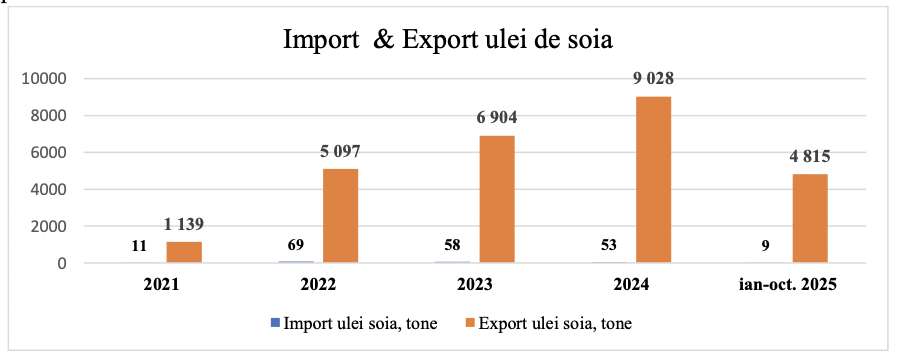 În ultimii patru ani, exporturile de ulei de soia au urmat o tendință ascendentă, crescând de la 1 139 tone în 2021 la 9 028 tone în 2024. Evoluția a reflectat atât extinderea procesării interne, cât și disponibilitatea materiei prime. Media prețurilor la export a variat puternic, coborând de la 26,7 lei/kg în 2022 la 12,9 lei/kg în 2024, pe fondul conjuncturii globale a piețelor de uleiuri vegetale.