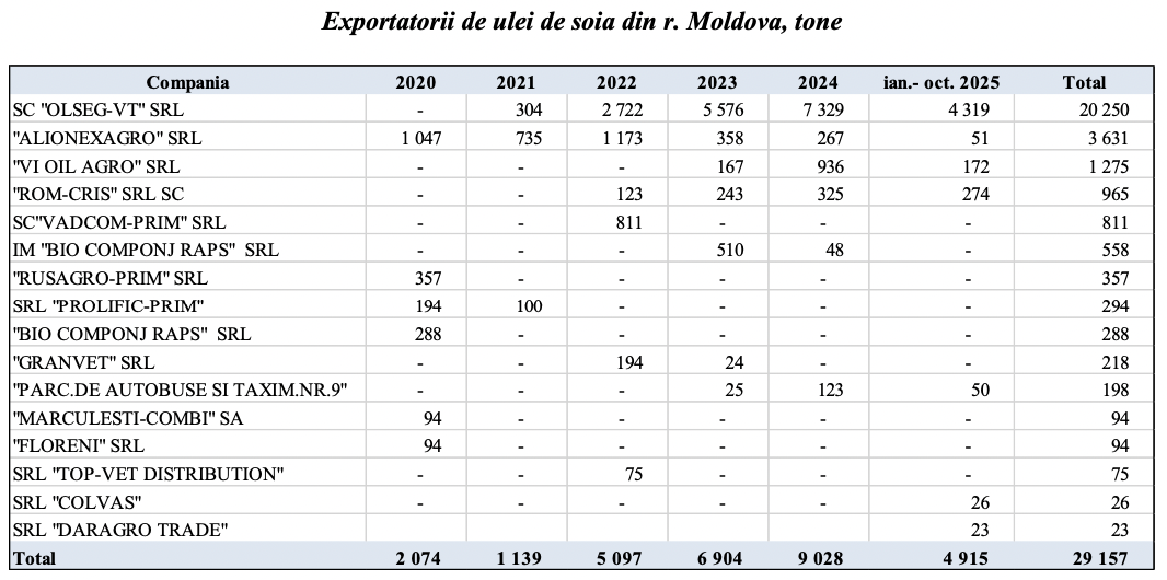 Ce ține de marii exportatori de ulei de soia la nivel național, liderul pieței rămâne compania OLSEG- VT, care a exportat 4 319 tone în primele zece luni ale anului curent. Cu toate acestea, ritmul său de export a înregistrat o diminuare vizibilă: volumul actual este cu 31% mai mic față de cele 6 254 de tone exportate în perioada ianuarie–octombrie 2024. Scăderea evidentă volumului reflectă impactul direct al reducerii disponibilității de boabe de soia pentru procesare, după introducerea taxei de 10% la exportul de soia din Ucraina.
