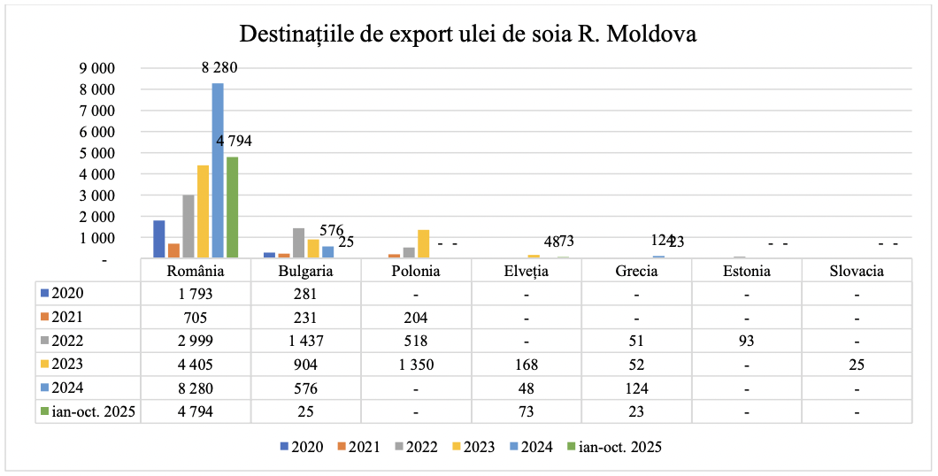 Situația se schimbă însă radical în 2025. În perioada ianuarie–octombrie, Republica Moldova a exportat doar 4 815 tone de ulei de soia, cu 38,3% mai puțin față de cele 7 805 tone exportate în perioada similară a anului 2024. Declinul reflectă, mai ales, diminuarea capacității de procesare a soiei la nivel național.