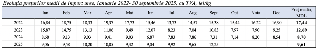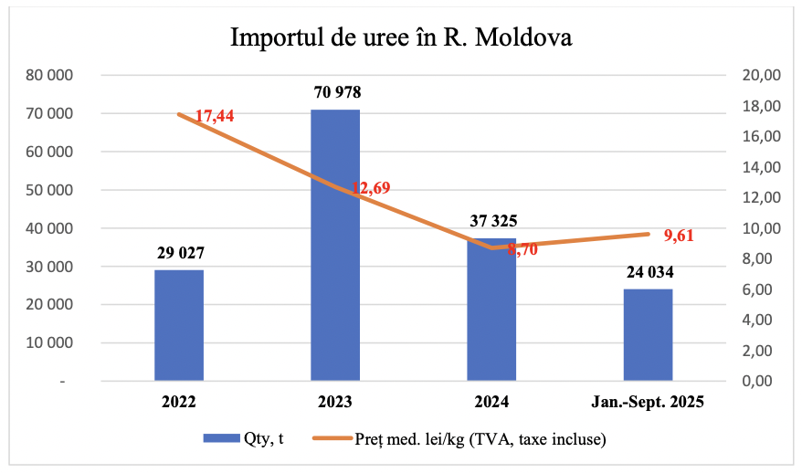 Tendința descendentă în importurile ureei se menține și în 2025. În primele nouă luni ale anului, Republica Moldova a importat 24 de mii de tone de uree, volum cu 21,6 % mai mic decât în perioada similară din 2024. Prețul mediu de import este de 9,61 lei/kg, ce înseamnă o creștere ușoară de circa 10% față de anul precedent. În termeni valorici, importurile din ianuarie – septembrie 2025 au atins 231,0 milioane lei, însă, dat fiind că 70% din cantitatea anuală este importată în lunile februarie – aprilie, este puțin probabil ca până la sfârșitul anului să fie recuperat nivelul din 2024.