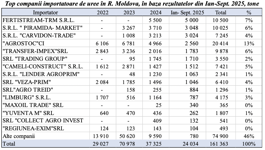 Primii 5 importatori de uree în R. Moldova în perioada ianuarie–septembrie 2025 au adus împreună aproape 40% din volumul total importat. Liderul segmentului este FERTISTREAM-TRM S.R.L., cu 5 mii de tone, urmată de S.R.L. “PIRAMIDA-MARKET” și S.R.L. “CARVIDON-TRADE”, fiecare cu câte 3 mii de tone. Compania “AGROSTOC” CI, cel mai mare jucător tradițional din sector, a importat în aceeași perioadă 2,56 mii de tone, menținându-și o cotă totală de 13% din piață, iar “TRANSFER-IMPEX” S.R.L. a completat topul primilor cinci importatori, cu 1,78 mii de tone.