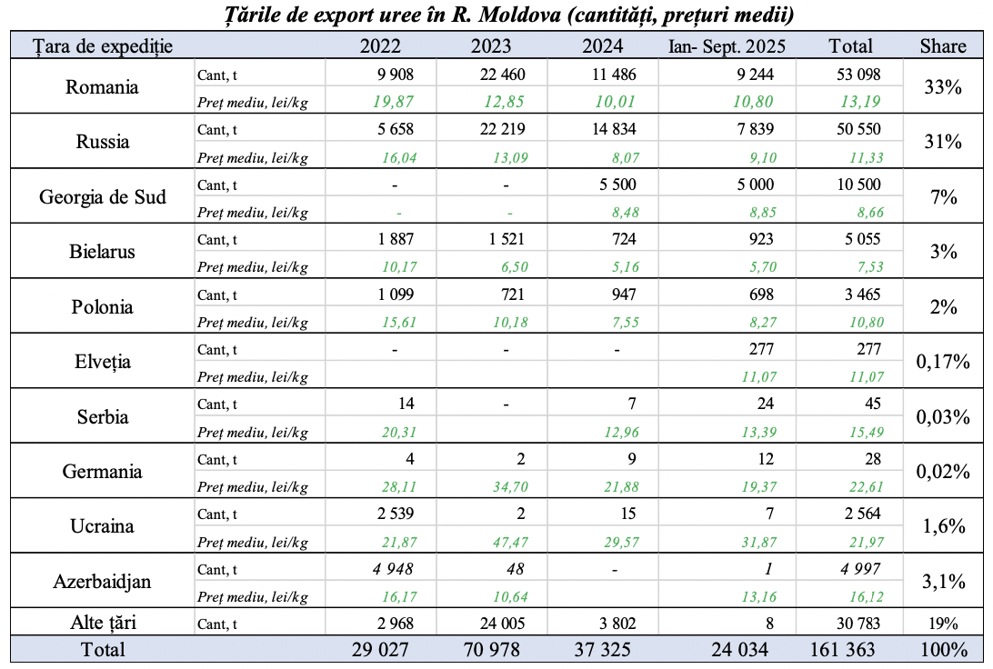 Analiza fluxurilor comerciale arată că, în perioada 2022 - septembrie 2025, cea mai mare parte a ureei importate în Republica Moldova a fost expediată prin România, care deține o cotă de 33% din totalul livrărilor. România s-a consolidat drept principal coridor logistic pentru aprovizionarea pieței moldovenești, inclusiv pentru volume provenite din state terțe, datorită infrastructurii portuare și rutelor prin porturile Constanța și Giurgiulești. Pe locul doi se află Rusia, cu o pondere de 31%. Următoarea poziție este ocupată de Georgia de Sud, cu 7%.