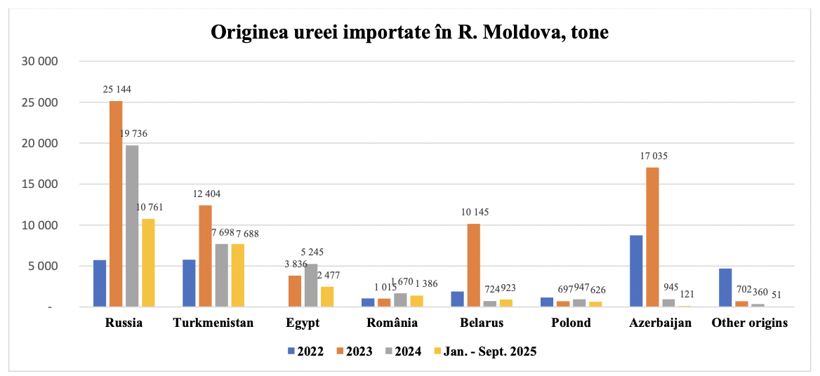 Totuși, țările de expediție diferă de țările de origine ale ureei efectiv produse și exportate în Republica Moldova. Conform datelor analizate pentru perioada 2022–septembrie 2025, Rusia rămâne principala sursă de origine a ureei, reprezentând 38% din totalul cantităților importate. Pe locul al doilea se situează Turkmenistanul, cu 21%, devenit un furnizor constant. A treia origine ca importanță este Egiptul, care și-a extins livrările spre piața moldovenească în ultimii ani, atingând o pondere de circa 9% din total.