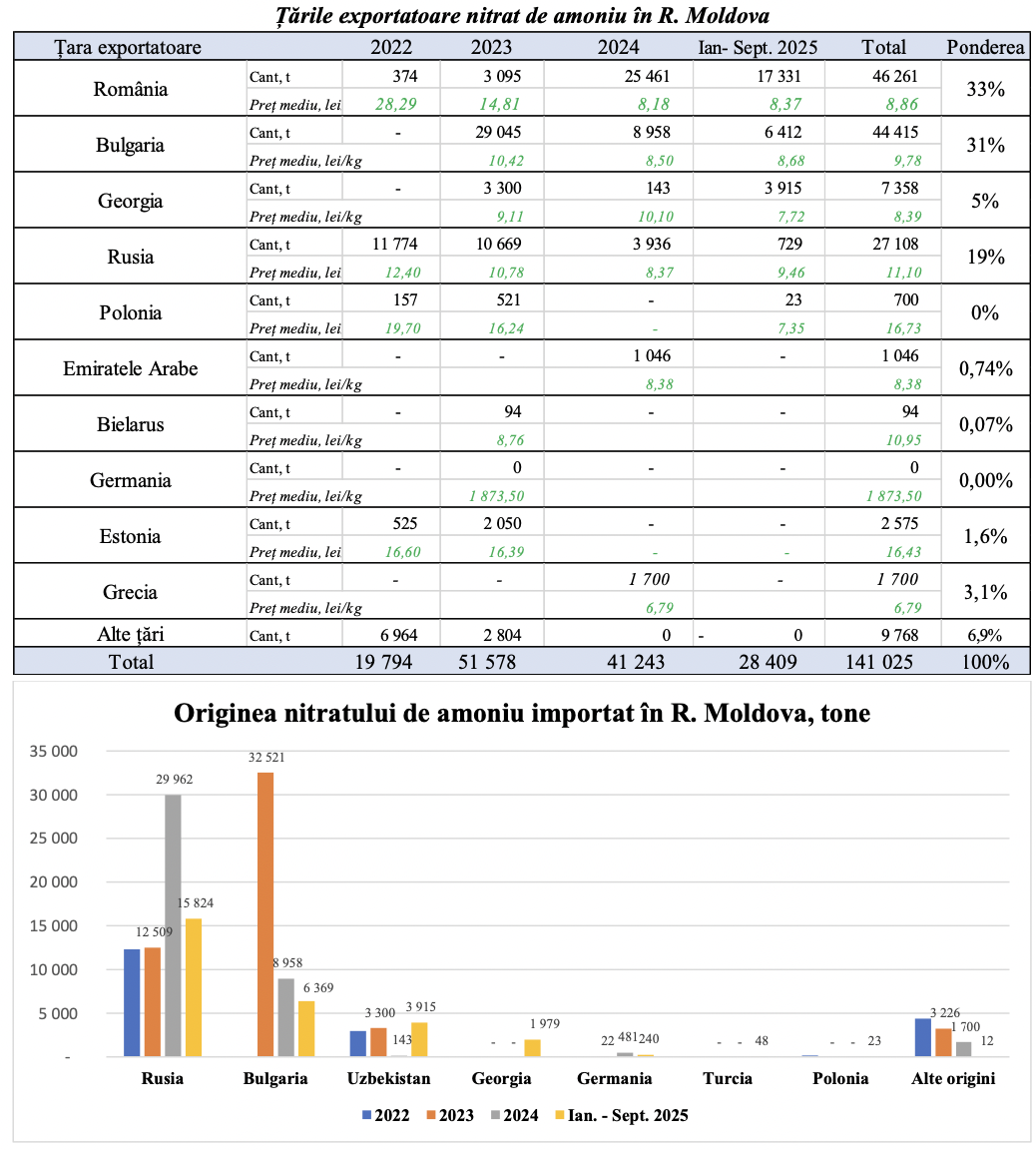 Furnizorii regionali oferă prețuri mai competitive: România — 8,37 lei/kg, Bulgaria — 8,68 lei/kg, Georgia — 7,72 lei/kg, față de 9,46 lei/kg pentru marfa rusească. Totuși, analiza originii produsului arată că o parte semnificativă a nitratului importat rămâne de proveniență rusă (55,7%), livrată prin intermediari din România sau Georgia.