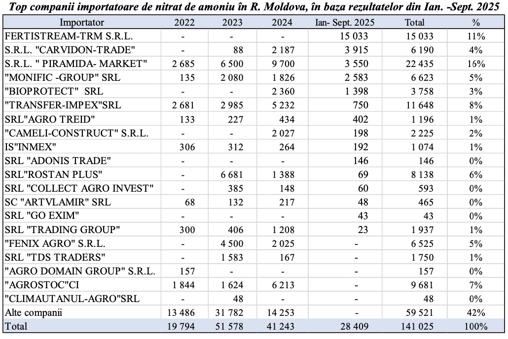 Structura pieței s-a schimbat considerabil. În 2025, lider al importurilor a devenit compania FertiStream-TRM S.R.L., cu 15 mii de tone — 53% din totalul național. Compania, nou-intrată pe piață, a devansat importatorii tradiționali precum Carvidon-Trade, Piramida-Market, Monific-Group și Transfer-Impex. În anii trecuți, Piramida-Market deținea constant poziția de lider, urmată de Transfer-Impex și Bioprotect.