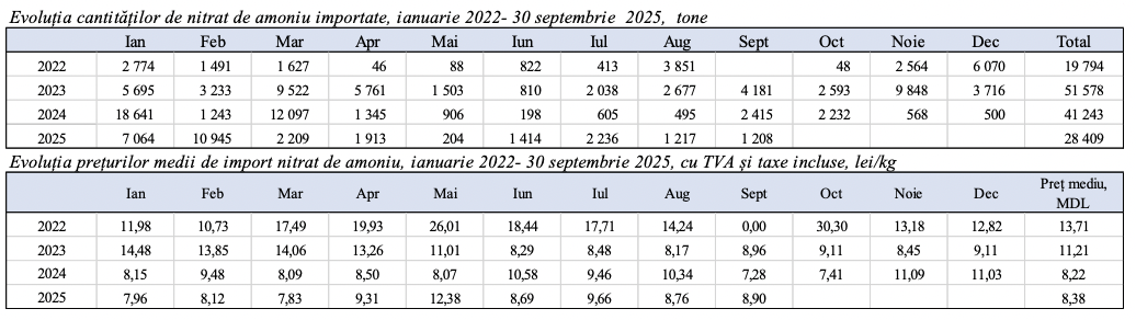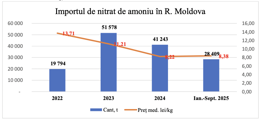 În 2025, nitratul de amoniu a înregistrat cea mai mică creștere de preț dintre toate tipurile de îngrășăminte. Importurile s-au concentrat în primele luni ale anului, când condițiile de piață erau mai favorabile. În ianuarie–februarie au fost aduse 18 mii de tone, adică 63% din totalul primelor trei trimestre. Strategia s-a dovedit eficientă, întrucât prețurile erau atunci în jur de 8 lei/kg. Din aprilie, tarifele au crescut brusc, ajungând la 9,6 lei/kg — peste nivelul din 2024.