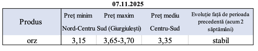 În Republica Moldova, orzul s-a confruntat și el cu intemperiile verii, însă dat fiind că perioada sa de vegetație se încheie mai devreme (se recoltează în iunie-iulie), a scăpat de seceta târzie care a afectat porumbul. Producția internă de orz în 2025 a fost apropiată de cea a anului anterior, asigurând acoperirea consumului intern (furajer) cu un disponibil pentru export. Prețurile orzului pe piața locală au rămas relativ stabile pe parcursul toamnei, fără oscilațiile vizibile comparative cu celelalte culturi. În prezent, orzul se vinde în gospodării cu 3,20–3,50 lei/kg în dependență de regiune și calitate. La Giurgiulești, orzul în continuare se cumpără la preț de 3,70 lei/kg- un preț înalt și neașteptat pentru sezonul actual. Comparativ cu anul trecut, când prețurile orzului au cunoscut o tendință de scădere pe fondul unei recolte europene abundente și al concurenței cerealelor mai ieftine, anul acesta trendul a fost ascendent.