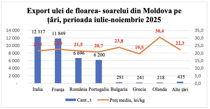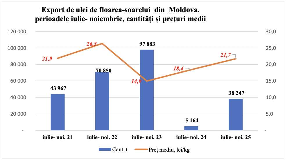 Sezonul curent se remarcă printr-o dinamică mai favorabilă a prețurilor. Prețul mediu de export în iulie–noiembrie 2025 a fost de 21,7 lei/kg, cu 18% peste cel din sezonul precedent (18,4 lei/kg). Comparativ cu anul 2023 – un sezon cu volum record, dar cu un preț extrem de scăzut, de doar 14,9 lei/kg – uleiul moldovenesc se vinde în 2025 cu aproximativ 45% mai scump.