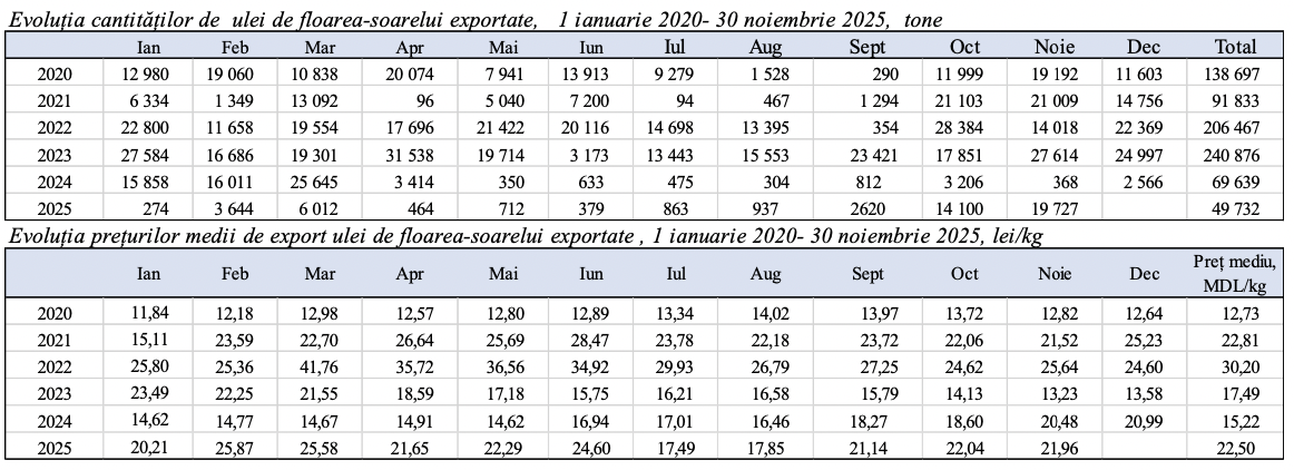 Luna noiembrie 2025 reprezintă un punct de cotitură pentru exportul de ulei de floarea-soarelui. În această lună au fost livrate 19,7 mii tone, cel mai mare volum lunar al sezonului. Rezultatul se apropie de nivelurile înregistrate în anii în care procesarea funcționa aproape de capacitate normală.