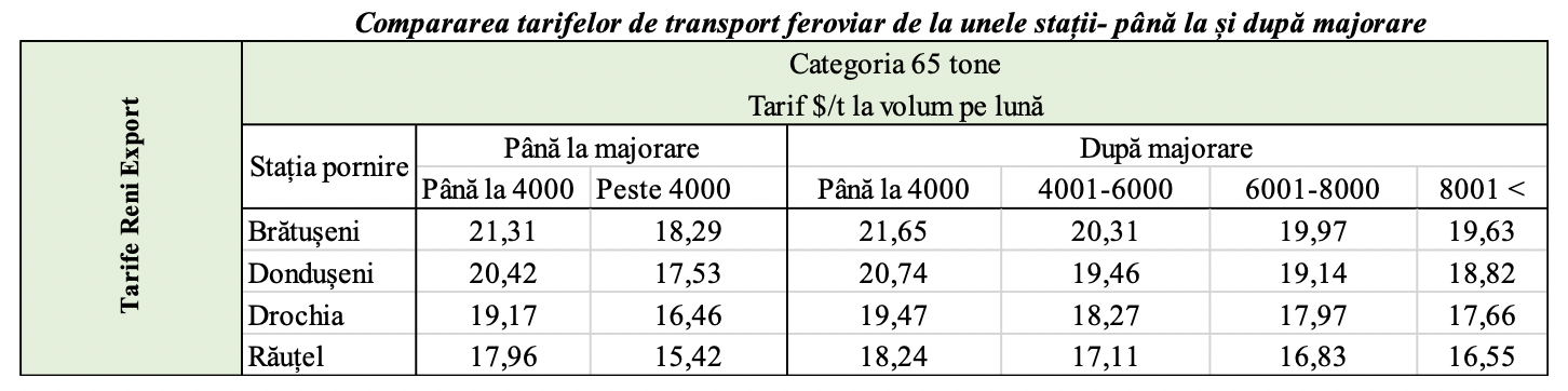 Creșterile de tarife sunt vizibile și în grilele pentru exportul către Reni. De exemplu, din stații precum Brătușeni, Dondușeni, Drochia sau Răuțel, tarifele pe tonă au crescut după majorare, chiar și pentru volume mari. În anumite rute, în special din sudul țării, costul feroviar a ajuns practic la egalitate cu transportul pe camion.