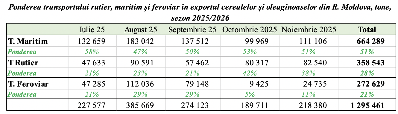 În Republica Moldova, sezonul 2025/2026 a început promițător din punctul dat de vedere. În lunile iulie–septembrie, ponderea transportului feroviar în exportul cerealelor și oleaginoaselor a depășit așteptările, atingând 21% în iulie și urcând la 29% în august și septembrie, un nivel mult mai ridicat decât în anii precedenți, când transportul feroviar rareori depășea 12–15%.Prin urmare, atunci când tarifele sunt competitive, calea ferată poate deveni un instrument real de optimizare a costurilor și de susținere a prețurilor la fermier.