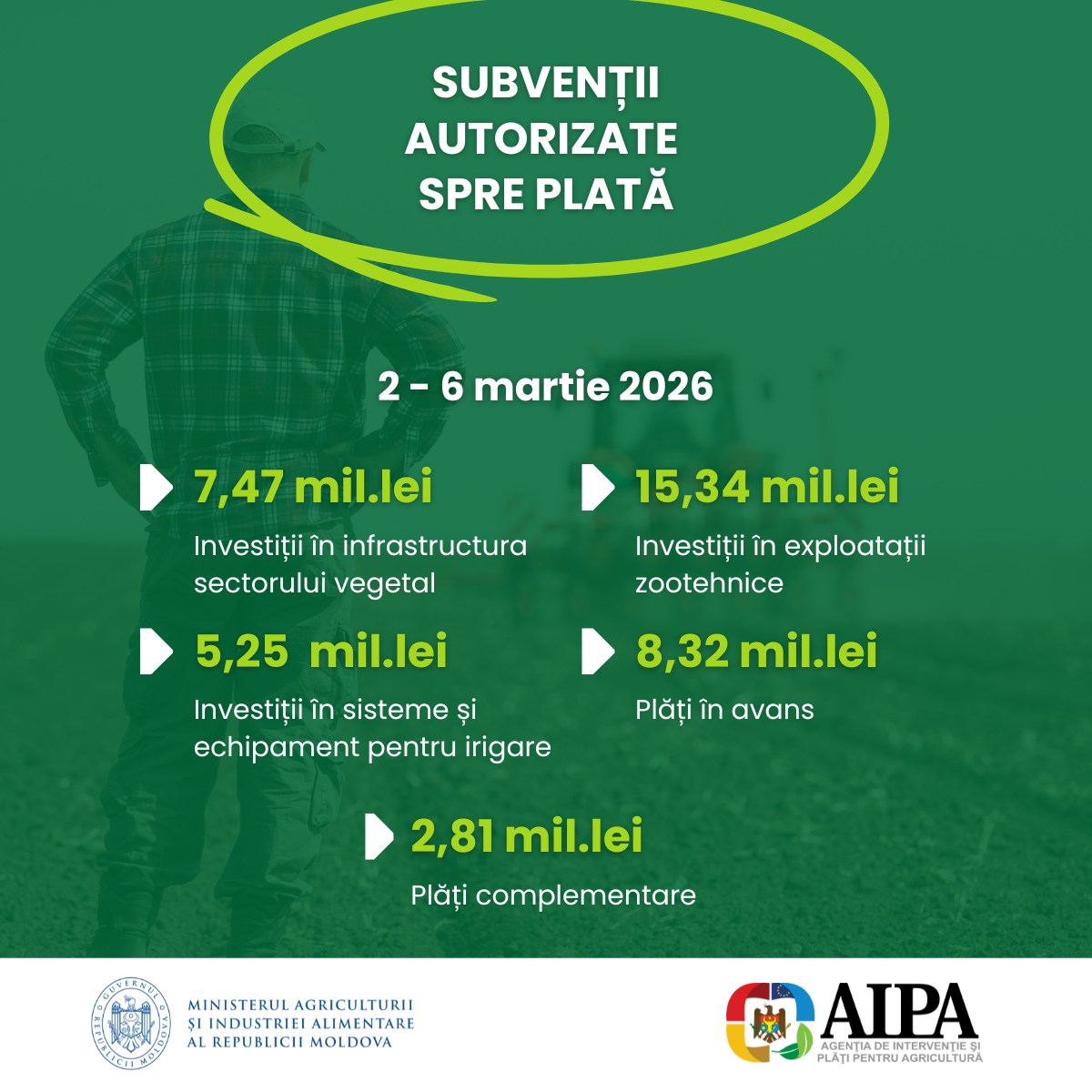 Agenția de Intervenție și Plăți pentru Agricultură (AIPA) a autorizat spre plată 45,12 milioane de lei pentru fermieri, în perioada 2–6 martie 2026. Fondurile provin din Fondul național de dezvoltare a agriculturii și mediului rural și sunt acordate prin mai multe mecanisme de subvenționare.