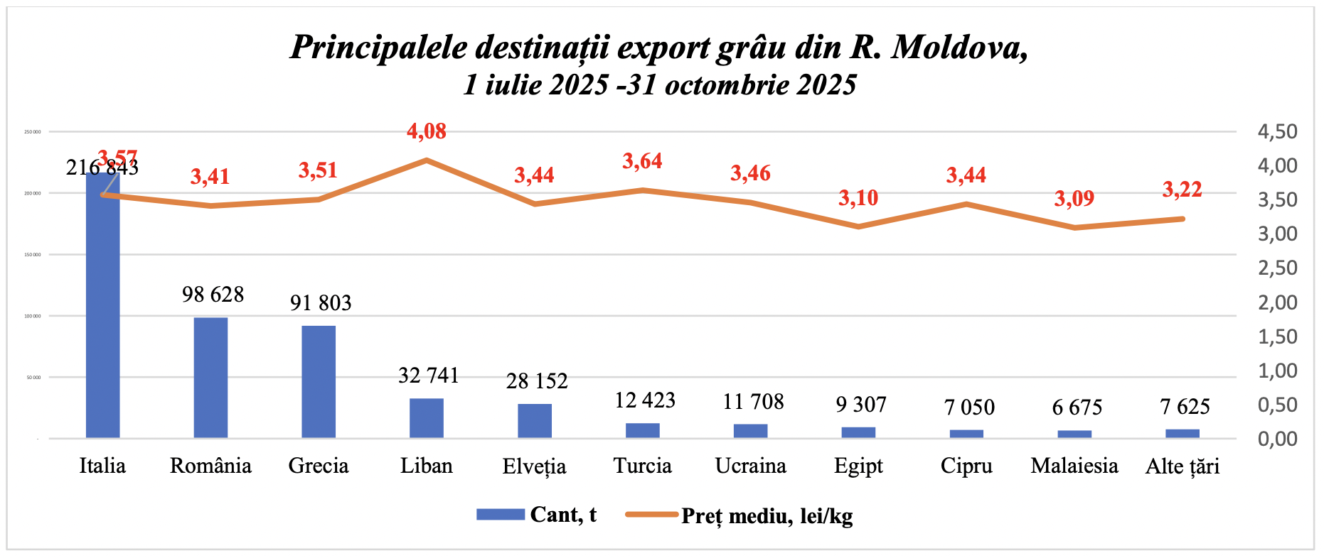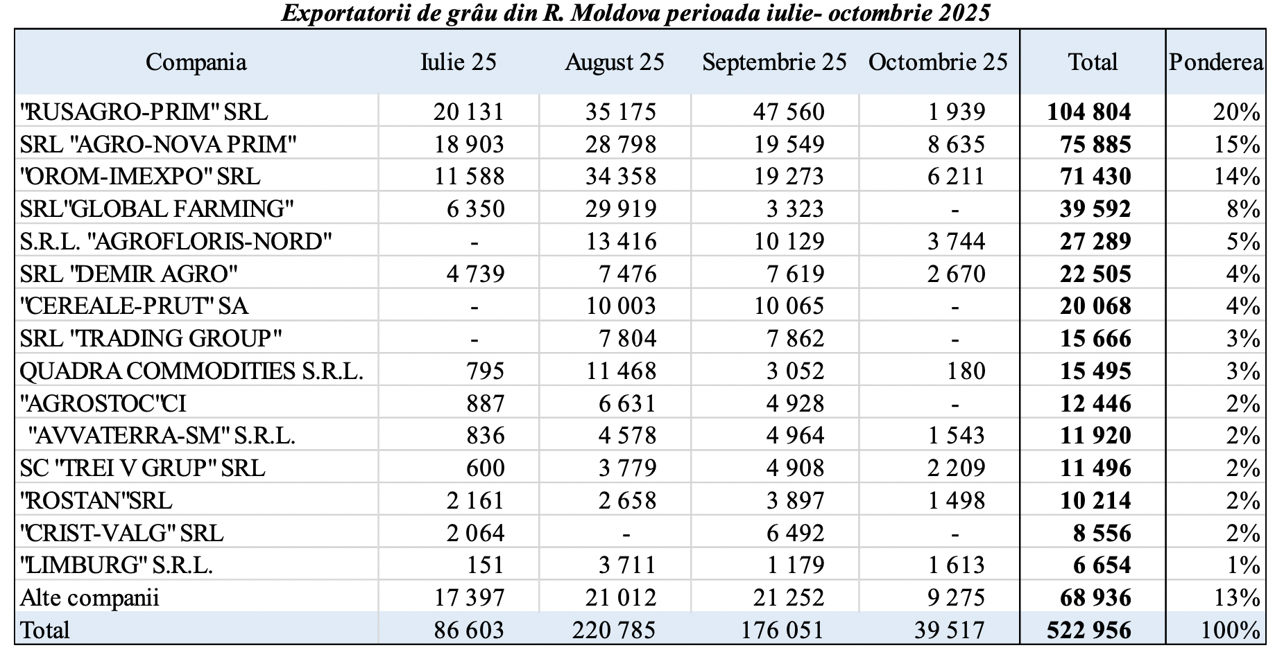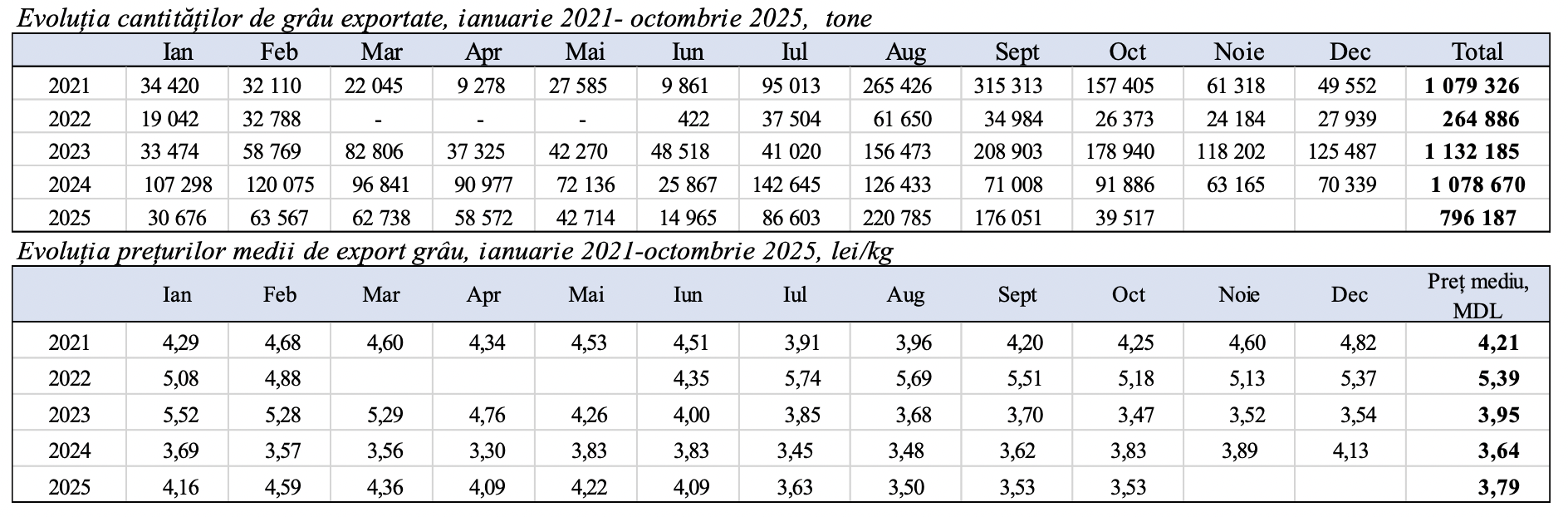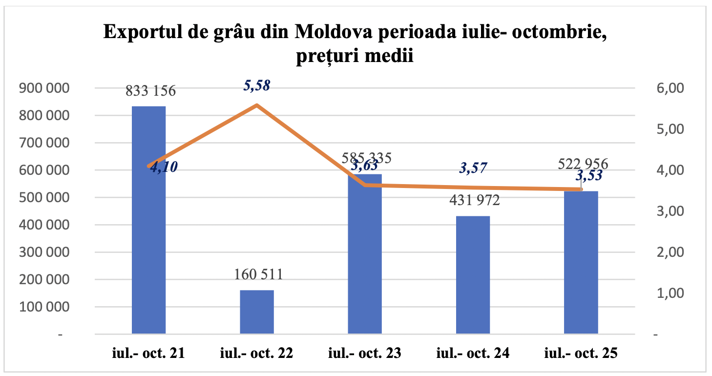 Exporturile de grâu ale Republicii Moldova, în sezonul 2025–2026, pentru perioada iulie–octombrie, au atins un volum total de 523 de mii de tone, în creștere cu 21% față de aceeași perioadă a anului trecut (432 de mii de tone). Totuși, chiar dacă livrările au crescut față de 2024, nivelul exporturilor rămâne sub cel din anii de referință.