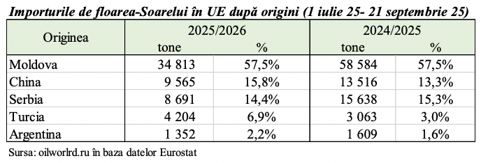 Republica Moldova continuă să fie principala origine de floarea-soarelui pentru Uniunea Europeană, chiar dacă sezonul încă nu a intrat pe deplin în faza sa activă. Ponderea Moldovei în importurile comunitare s-a menținut la un nivel de 57,5%, echivalent cu 34 813 tone livrate, Interesant este faptul că și în sezonul precedent, în aceeași perioadă, cota Moldovei în importurile UE a fost identică, 57,5%, dar cu un volum mai mare, de 58.584 de tone. Moldova a reușit să depășească din nou origini importante precum China, Serbia, Turcia și Argentina. Datele se conțin în analiza expertului în agro-market Iurie Rija.