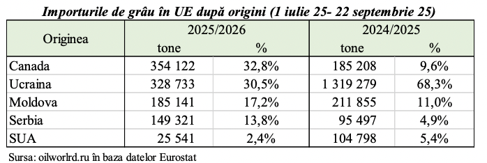 Datele pentru perioada 1 iulie – 22 septembrie 2025 confirmă o schimbare semnificativă în structura importurilor de grâu ale Uniunii Europene, dar și o consolidare a Republicii Moldova ca furnizor regional. Cu 185 141 de tone livrate în primele trei luni ale sezonului, Moldova și-a crescut cota de piață în UE la 17,2%, față de 11% în aceeași perioadă a anului trecut. Chiar dacă volumul exportat către UE este mai mic decât anul trecut, ponderea Moldovei a crescut tocmai pentru că fluxurile tradiționale din Ucraina s-au redus, iar statele comunitare caută surse stabile și apropiate.