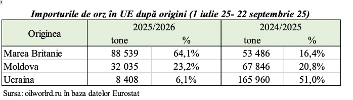 La capitolul orz, datele pentru perioada 1 iulie – 22 septembrie 2025 arată că Republica Moldova continuă să fie un furnizor important de orz pentru Uniunea Europeană, chiar dacă volumele exportate sunt mai mici decât anul trecut. Cu 32 035 tone livrate, echivalent cu o cotă de 23,2% din importurile totale ale UE, Moldova se plasează pe locul al doilea, după Marea Britanie, care domină clasamentul cu 64,1% și 88 539 de tone. Ucraina, care anul trecut furniza peste jumătate din importurile de orz ale UE, a coborât la doar 6,1%, cu puțin peste 8 400 de tone.