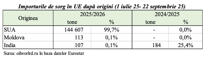 În prezent, Uniunea Europeană își acoperă aproape integral necesarul de sorg prin importuri din Statele Unite, care în acest sezon au livrat peste 144 000 tone, reprezentând 99,7% din total. Alături de SUA, doar India și Moldova figurează în statistici, fiecare cu câteva sute de tone, dar prezența lor semnalează deschiderea pieței europene pentru diversificarea originilor. Pentru Republica Moldova asta poate fi privit ca o oportunitate strategică.